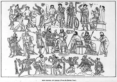 در سال ۱۸۵۱ میلادی در میان یک قبر در شهر کاتوزا از ایالت اپولین ایتالیا یک کوزه پیدا شدهاست که به نظر پژوهشگران مجلس شورای جنگی داریوش را در سال ۵۲۱ پیش از میلاد نشان میدهد. این تصویر به تفصیل تشریح شدهاست.