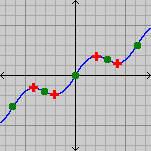 نقاط مانا (علامت مثبت قرمز) و نقاط عطف (دایرههای سبز). همه نقاط مانا در این نمودار، کمینه یا بیشینه موضعی هستند.