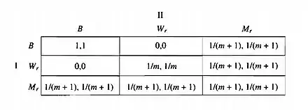 به دو بازیکن مهره نشان داده میشود. مهره سفید رنگ و ۱ مهره آبی رنگ است. هر بازیکن یکی از مهرهها را بدون اطلاع از انتخاب باریکن دیگر انتخاب میکند. اگر هر دو بازیکن یک مهره را انتخاب کنند دستاوردی به اندازهٔ ۱ واحد مطلوبیت دریافت میکنند در غیر اینصورت هیچ دستاوردی نخواهندداشت. همچنین فرض میشود اگر بازیکنها مهرهٔ سفید را انتخاب کنند راهی برای تشخیص اینکه مهرههای انتخاب شده مانند هم هستند یا نه وجود دارد ولی بازیکنها نمیتوانند مهرههای سفید را از یکدیگر تشخیص دهند. در ضمن m هم به اندازهٔ کافی بزرگ است.