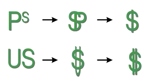 علامت $ برای دلار آمریکا و بسیاری از کشورهای دیگر استفاده میشود. در قرن ۱۸ میلادی ps برای پزو استفاده میشد و به مرور دو حرف s و p به هم چسبیده شده و علامت $ را تشکیل دادند. اس با خط عمودی «$» که علامت بینالمللی دلار است نیز از اسپانیاییها اقتباس شده که پول خود را با علامت P (پی) مشخص میکردند و این "P" در آمریکای شمالی به تدریج و در جریان نوشتن به شکل «$» درآمد.[4][5][6][7]