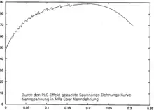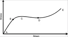 وقتی مادهای امکان تغییر شکل پلاستیک داشتهباشد، منحنی تنش-کرنش مهندسی آن به صورت روبرو خواهد بود.[11] از آنجایی که این مواد نقطهٔ تسلیم مشخصی ندارند، از کرنش قرارداد تسلیم برای تعیین نقطهٔ تسلیم در آنها استفاده میشود. حد تسلیم تنشی در نظر گرفته میشود که کرنش مومسانی برابر با کرنش قراردادی تسلیم ایجاد کند.