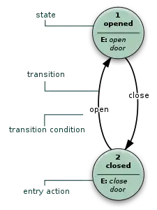 در شکل زیر S1 و S2 حالات مدار و S1 حالت پذیرش، میباشد. هر یک از بردارهای لبه با یک ورودی نشانه گذاری شدهاست. مثلاً در حالت S2 در صورتی که ورودی ۱ به مدار اعمال شود، سیستم در حالت خود میماند.