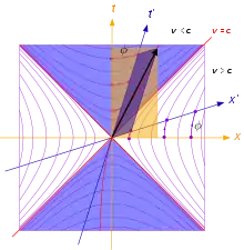 نمودار مینکوفسکی با چارچوب در حال سکون (x,t), چارچوب در حال حرکت(x',t'), مخروط نور, و هذلولیهایی که زمان و فضا را نسبیت به مبدأ نشانهگذاری میکنند.