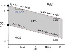 مانند بالا با استفاده از معادله نرنست اما با E0 =-ΔG0H2O/2F = 1.229 V، محدوده بالایی پایداری آب در فشار و دمای استاندارد به دست می آید: