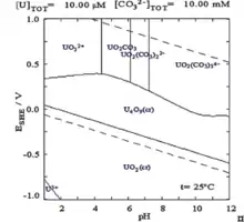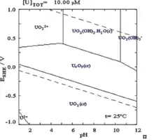 در اکثر موارد شرایط ممکن در یک سیستم توسط منطقه پایداری آب محدود می شوند. در نمودار پوربه اورانیوم محدوده ی پایداری آب با دو خط چین مشخص شده است و منطقه پایداری آب در بین این دو خط قرار می گیرد.