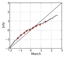 در آمار، یک نمودار چندک-چندک یا نمودار کیو-کیو (به انگلیسی: Q-Q plot، مخفف quantile-quantile plot) یک نمودار احتمال است که روشی نموداری برای مقایسه دو توزیع احتمال با استفاده از رسم دو چندک در مقابل یکدیگر میباشد. ابتدا مجموعهای از بازهها برای چندکها انتخاب میشود. نقطه (x,y) بر روی نمودار، به یکی از چندکهای توزیع دوم (مختصات y) مربوط میشود که در مقابل چندک مشابه از توزیع اول (مختصات x) رسم میشود. در نتیجه این خط، یک منحنی پارامتری میباشد که پارامتر آن اعداد بازه چندک است.