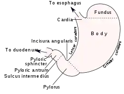 معدهٔ نهنگها، مانند گوشتخواران خشکی، دارای دو تا سه بخش است. نهنگهای بیدندان یک پیششکمچه در امتداد مری خود دارند تا مواد غیرخوراکی مانند سنگها در آن ریخته شود. علاوه بر آن، بخشهای بندآر و قعری هم در معدهٔ آنها وجود دارد.[40]