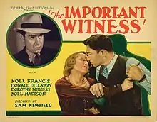 ![]() Lobby card for The Important Witness (1933) with Noel Madison (upper left) | |