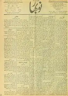 صفحهٔ اول روزنامهٔ نوبهار، شمارهٔ ۷۴، ۱۷ دسامبر ۱۹۱۷، از وبگاه سازمان اسناد و کتابخانهٔ ملی ایران (بیشتر)