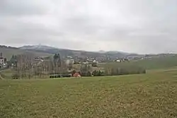 ![]() View of Nová ves nad Popelkou of the hill above the cemetery, in the background Mount Tabor | |