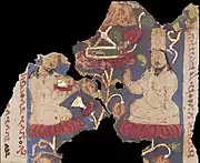 برگی از ورقه و گلشاه اثر مومن محمد خویی، دیوارسواران، محتملا آذربایجان، نیمه نخست سده هفتم میلادی، از عناصر شاخص در ورقه و گلشاه چهرهای ماهرو، هالههای طلایی دور سر و بازبندهای طلایی است