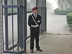- کمکنگهبان: فردی است غیر مسلح مجهز به سرنیزه و چراغ قوه جهت کمک به نگهبان در انجام وظایف محوله. وظایف کمک نگهبان انجام اموری است که انجام آنها برای نگهبان مسلح خطرناک یا غیرممکن است مانند تفتیش بدنی و کنترل داخل اتومبیل. کمک نگهبان نباید هیچگاه در خط تیر نگهبان قرار گیرد.[1]