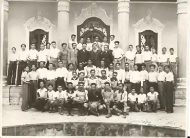 عکس یادگاری تعدادی از دانش آموزان دبیرستان فیروزبهرام در حیاط آدریان تهران، اردیبهشت ۱۳۲۴ خورشیدی