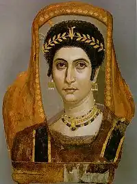 تکچهره فیوم از یک زن که تاج گل طلا به سر دارد، ۱۰۰ تا ۱۱۰ پس از میلاد