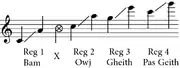 دقیقاً همانند بم اما یک اکتاو بالاتر. دو نت آخر (سل و لا) با غیث مشترک است.