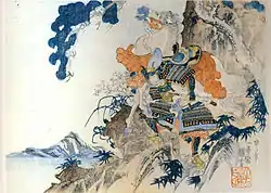 تصویری خیالی از هاتاکهیاما شیگهتادا در حالیکه اسب خود را بر گرده گرفته و از کوه پایین میآید.