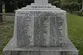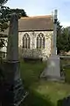 Side view of the chancel, an obelisk and the war memorial of Church of S.S. Peter & Paul, 2014.
