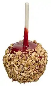 به این دلیل که در نیمکره شمالی، جشن هالووین همزمان با برداشت سالیانهٔ سیب است، آبنبات سیب، کارامل سیب و تافی سیب از خوراکیهای معمول هالووین است که با چرخاندن سیبهای کامل در یک شربت قند چسبناک ساخته میشود و گاهی اوقات آنها را در آجیل میغلتانیم.