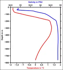 - حدود ۵۰ متر از آب شوری کم «شنا» در بالای اقیانوس. درجه حرارت -۱٫۸ درجه سانتیگراد است که بسیار نزدیک به نقطه ی انجماد است. این لایه انتقال حرارت را از سطوح گرمتر و عمیقتر به یخ دریا متوقف میکند که اثر قابل توجهی بر ضخامت آن دارد.