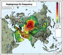 احتمال زیاد اعتقاد بر این است که G1 در ایران سرچشمه گرفتهاست. این فرکانس در جمعیتهای مدرن به جز (i) ایران و همسایگان غربی آن، و (ii) منطقه ای که از جنوب مرکزی سیبری (روسیه) و شمال قزاقستان متصل است، دارای فرکانس بسیار کمی است. اساسیترین نمونههای G1 در افراد زنده شناسایی شدهاست و در سراسر منطقه از شبه جزیره عربستان تا بلاروس یافت شدهاست.