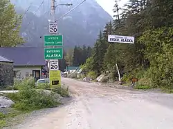 ![]() The border between Stewart, British Columbia and Hyder, as seen from the Canadian side. | |