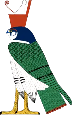 | ویژگیها: | او معمولاً به صورت عقابی با تاج به تصویر کشیده میشود. تاجی که بر سر دارد، نشانهٔ پادشاهی بر تمام مصر علیا و مصر سفلی است. |