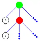 - اگر در یک راس نوبت با بازیکن دوم باشد ارزش آن راس برابر است با کمترین ارزش نسبت داده شده به فرزندان آن (به چنین راسی Min node یا راس کمینه گفته میشود)