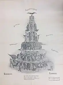 تصویر شرحی از سلسله مراتب یا «هرم اجتماعی» با تعداد کمی ثروتمند در بالا و تودههای فقرا در طبقه زیرین است. یک کیسه پول (en) نمایانگر سرمایهداری در تاج، طبقه بالایی اول «ما بر شما حکم میرانیم» توسط سلطنت و رهبران حکومت پر شده. طبقه بعدی روحانیت است با عنوان «ما شما را فریب میدهیم»، سپس ارتش با عنوان «ما به شما شلیک میکنیم»، سپس بورژوازی با عنوان «ما به جای شما میخوریم». طبقه زیرین هرم که توسط کارگران پر شده میگوید «ما برای همه کار میکنیم... ما به همه غذا میدهیم».[4][8][3][2]