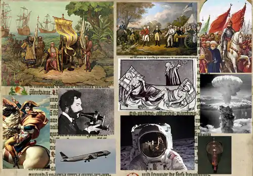 از چپ ساعتگرد: در ۱۴۹۲ کریستف کلمب دنیای جدید را کشف میکند، انقلاب آمریکا در ۱۷۷۶، انقلاب فرانسه، بمب اتمی در جنگ جهانی دوم، مرگبارترین جنگ تاریخ، لامپ، قدم گذاشتن نیل آرمسترانگ روی ماه سال ۱۹۶۹ در برنامه آپولو ۱۱، هواپیماها مورد استفاده وسیع قرار گرفتند، ناپلئون بناپارت در اوایل سده ۱۸ (میلادی)، الکساندر گراهام بل مخترع تلفن، مرگ سیاه در سال ۱۳۴۳ موجب کشته شدن ۱۰۰ میلیون انسان شد. (پس زمینه: کتاب مقدس گوتنبرگ اولین کتاب چاپ شده)