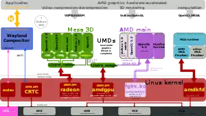 - مدیر مستقیم ارائه دهنده (DRM) و تنظیم حالت کرنل (KMS) - برای ارتباط با GPUها و پشتیبانی از نیازهای سختافزاری ویدیویی مدرن با سرعت سه بعدی، و برای تنظیم وضوح صفحه، عمق رنگ و سرعت تازه سازی