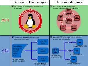 برخی از APIهای هسته لینوکس در چندین نسخه ثابت نگه داشته شدهاند، برخی دیگر اینگونه نیستند. هیچ تضمینی در مورد APIهای هسته وجود ندارد. نگهبانان و مشارکت کنندگان میتوانند هر زمان که بخواهند تقویت کنند یا آنها را تغییر دهند. با این وجود، APIهای درون هسته وجود دارند که ساختار دادهها را دستکاری میکنند (به عنوان مثال، لیستها، درختان، صفها) یا کارهای روزمره را انجام میدهند (به عنوان مثال کپی کردن دادهها از و به فضای کاربر، اختصاص حافظه، خطوط چاپی به سیستم سیستم و غیره) که حداقل از نسخه ۲٫۶ لینوکس پایدار ماندهاند. نمونههایی از APIهای درون هسته شامل کتابخانههای خدمات مشترک سطح پایین است که توسط درایور دستگاهها استفاده میشود: