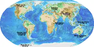 | ✔ | ✔ | کوه لوگان | ۵٬۹۵۹ | ۱۹٬۵۵۰ | آمریکای شمالی | کانادا |