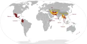 در سال ۱۹۹۱، افغانستان بزرگترین تولیدکننده تریاک در جهان بود و بعد از آن میانمار، که بخشی از مثلث طلایی میباشد.