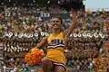 یک هلهلهچی دانشگاه ایالتی لوئیزیانا در حال رهبری کردن تشویق تماشاچیان در یک مسابقه فوتبال آمریکایی