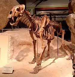 | اسکلت هماندد سری (Homotherium serum) از غار فریزنهاهن، موزه یادبود تگزاس، دانشگاه تگزاس در آستین | |