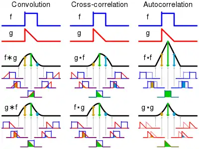 مقایسهٔ بصری کانولوشن، همبستگی متقابل و خودهمبستگی. برای عملیات با استفاده از تابع f و فرض ارتفاع f برابر ۱٫۰ است، مقدار نتیجه در ۵ نقطه مختلف توسط منطقه سایه دار زیر هر نقطه نشان داده شدهاست. همچنین تقارن عمودی f به دلیل {\ displaystyle f * g} {\ displaystyle f * g} و {\ displaystyle f \ star g} {\ displaystyle f \ star g} در این مثال یکسان است f is the reason and .