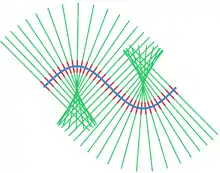 A curve, in blue, and some lines perpendicular to it, in green. Small portions of those lines around the curve are in red.