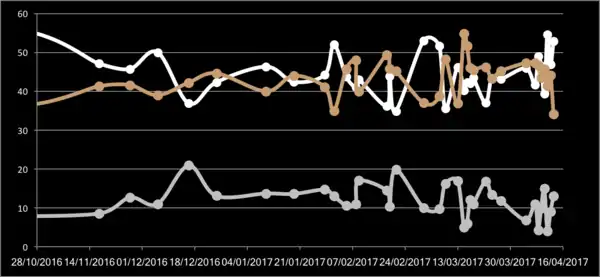 | ۳ تا ۱۳ مارس ۲۰۱۷ | Politic's | ۲٬۷۵۳ | ۴۶٫۲ | ۳۶٫۹ | ۱۶٫۹ | ۵۵٫۷ | ۴۴٫۳ | |