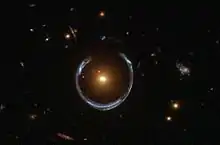 در این تصویر که به صلیب اینشتین معروف است، بر اثر همگرایی گرانشی شدید، چهار تصویر از یک جسم نورانی دوردست به دور کهکشان پرجرمی که در مقابل است ساخته میشود.