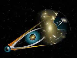 خمیدگی نور چشمهای دوردست به دور جسمی پرجرم. پیکان نارنجی نشاندهندهٔ مکان ظاهری چشمه است. پیکان سفید مسیر نور را از مکان واقعی چشمه نشان میدهد.