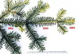شاخه نراد نقرهای با برگهایی از سه سال پیاپی.