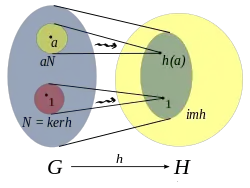 تصویر یک همریختی گروهی () از (سمت چپ) به (سمت راست). بیضی کوچکت درون ، تصویر است. هسته و همدسته است.