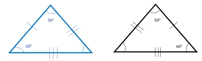 در شکل زیر ،دو مثلث را میبینیم که زوایا و ضلعهای برابری دارند.