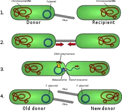 - 8. Waters VL (December 2001). "Conjugation between bacterial and mammalian cells". Nat. Genet. 29 (4): 375–6. doi:10.1038/ng779. PMID 11726922.