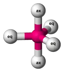 از آن جایی که در این ساختار، امکان وجود یک زاویه پیوندی واحد وجود ندارد، پس دو نوع گروه در این ساختارها دیده میشود. ساختارهایی که بر روی مثلث میانی قرار میگیرند استوایی و ساختارهای روی رئوس دو هرم، محوری نامیده میشوند. گزینش پذیری و تمایل گروههای گوناگون برای انتخاب یکی از این حالتهای فضایی به اثرات فضاالکترونی بستگی دارد.