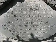 به یاد سر هنس اسلون، بارت، رئیس انجمن سلطنتی، و رئیس کالج پزشکان، که در سال ۱۷۵۳ در نود و دو سالگی بدون کمترین درد جسمی و با هوشیاری کامل، به پایان زندگی با فضیلت و سودمند خود رسید. این یادبود توسط دو دختر او الیزابت کادوگان و سارا استنلی ساخته شد.