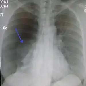 | پنوموتوراکس (p خوانده نمیشود) خود به خودی سمت راست. فلش لبه ریه جمعشدگی را نشان میدهد. | |