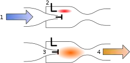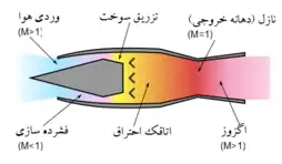 در موتورهای توربوجت، ابتدا، هوا وارد کمپرسور شده و متراکم میگردد. اما چون این هوا با سرعت نسبتاً زیادی وارد موتور گردیده برای احتراق مناسب نیست و بیشتر سوخت مصرف شده، بدون اشتعال هدر میرود. به همین دلیل هوا به قسمت دیفیوزر یا همان کاهنده سرعت فرستاده میشود تا از سرعت آن کاسته شود. در دیفیوزر، ابتدا از سرعت هوا کاسته و بر دما و فشار آن افزوده میشود. سپس این هوای آماده برای احتراق، به اتاقک احتراق فرستاده میشود. در اتاقک احتراق یا Combaustion Chamber، هوا ابتدا وارد لوله احتراق گشته، با سوخت مخلوط شده سپس محترق میگردد. قسمتی از نیروی حاصله از این احتراق صرف گرداندن توربین شده و مابقی برای تولید نیروی رانش به کار میرود. گاهی در هواپیماهای توربوجت، بعد از شیپوره خروجی یا نازل، قسمتی به نام پس سوز (After Burner) قرار میدهند که بر نیروی محرکه میافزاید.