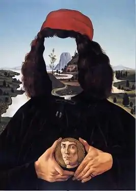 در کارِ بوتیچلی مرد جوان مدالی در دست دارد که بر آن نیمرخ کازیمو مدیچی نقش شده. در کار آغداشلو مرد جوان چهره ندارد و چهره اش به همان صورتی که در نقاشی بوتیچلی است بر مدالی که در دست دارد دیده میشود.