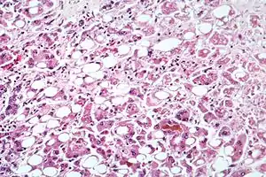 | Alcoholic hepatitis evident by fatty change, cell نکروز، Mallory bodies | |